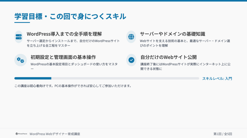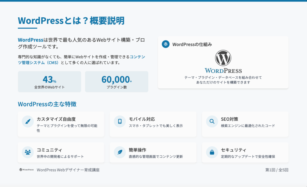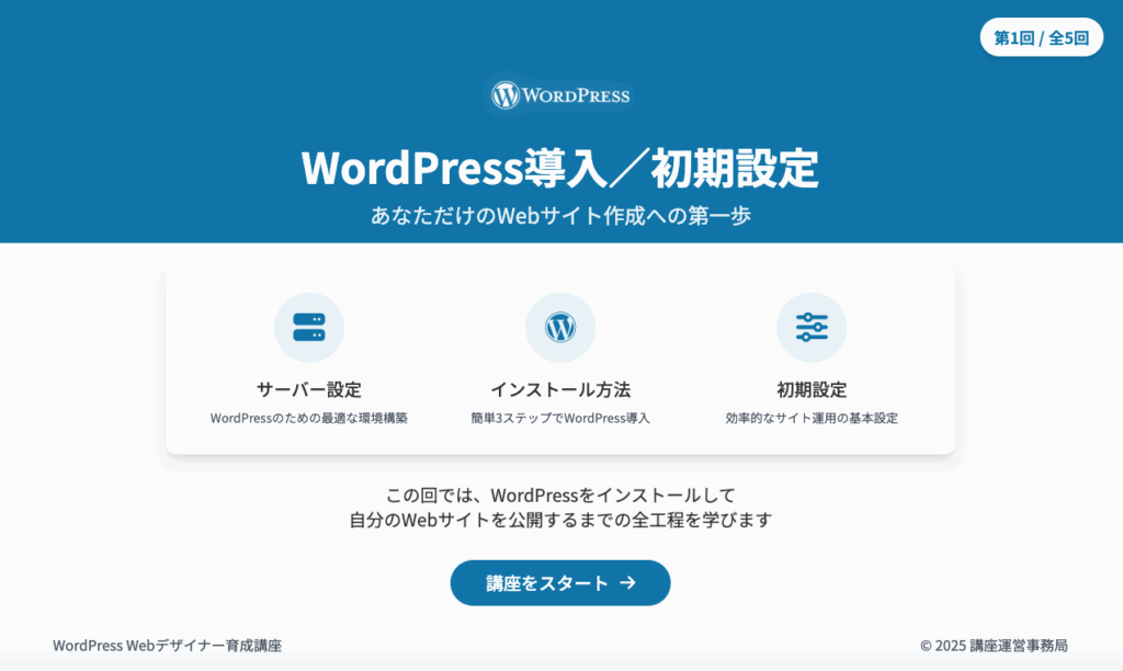 第1回:WordPress導入/初期設定 2025 7/11 未分類 このような資料に基づいてWebビデオ講座を進めてゆきます。第1回講座の内容は講座内容を見るボタンからどうぞ! Webビデオ講座内容を見る 未分類 よかったらシェアして下さい! URLをコピーしました! URLをコピーしました! WordPress Webデザイナー育成講座を開始します。 この記事を書いた人 wpmaster 代 表 Webの世界を広げます! 誰でもが、自社・自店の魅力を情報発信。 進化する生成AIを活用して、思い通りのWebサイトを制作して行きましょう! そんな仲間達が集まるWeb集団を目指します! 関連記事関連する記事はまだ見つかりませんでした。 コメント コメントする コメントをキャンセルコメント ※ 名前 ※ メール ※ サイト 次回のコメントで使用するためブラウザーに自分の名前、メールアドレス、サイトを保存する。